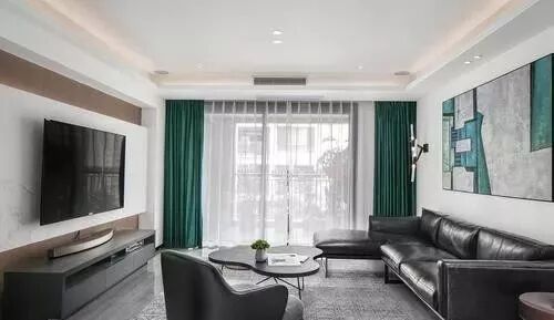 淡绿色的窗帘给人清爽的感觉,搭配深绿色的三人沙发,也是很和谐的,同为绿色,但饱和度不一样,层次感也有了。