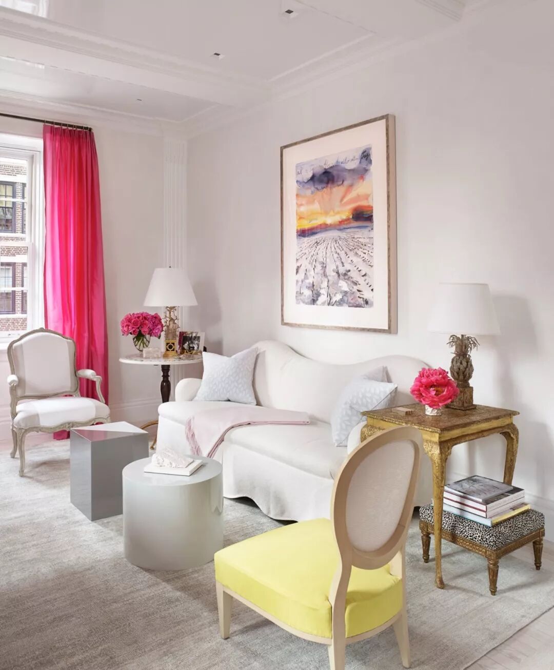 这间客厅整体上采用大面积的纯白色调,