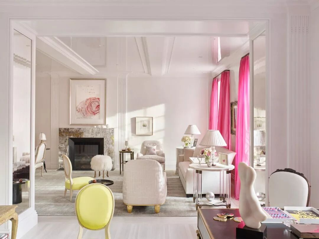 甜菜根色的窗帘和黄绿色的单人椅