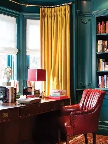 2.亮黄色的窗帘与椅子相呼应,还好选的椅子面积很小,不然大面积的饱和色空间估计很难舒服的呆着。于此同时也遵守了前面第一个原则,比墙面深了几度。