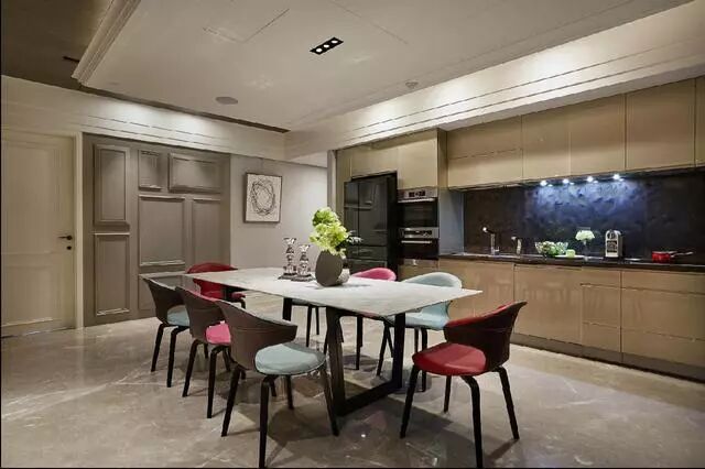 餐厅是进餐的专用场所,它的空间一般会和客厅连在一起,在色彩搭配上要和客厅相协调。具体色彩可根据家庭成员的爱好而定,一般应选择暖色调,如深红色、橘红色、橙色等。