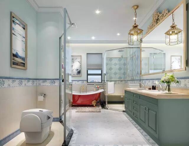 卫浴间的墙面,地面在视觉上占有重要地位,颜色处理得当有助于提升装饰效果。一般由白色、浅绿色、玫瑰色等。材料可以是瓷砖或者马赛克,一般以接近透明液体的颜色为佳,可以有一些淡淡的花纹。