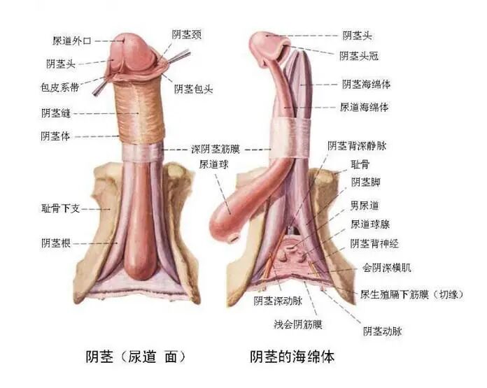 阴茎海绵体有两个,呈香蕉状,是独立的勃起器官,它位于尿道海绵体的上方,与尿道海绵体是分离的独立的解剖结构。