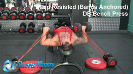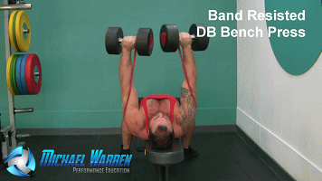 在这个固定阻力带卧推中,我们把整个动作加入一个对角矢量,使得胳膊和哑铃可以像两边伸展,离开中立位,你可以想像下,这样你可以专注在要把哑铃推到的位置,想要的角度,从而创造一个更大程度的肌肉收缩,尤其是你把哑铃推到顶点的时候。