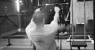 首先,在单杠上挂上吊环,采用站姿抓握把手,手臂笔直向前伸。然后启动肩部肌群向上抬起杠铃片,感受肩胛骨向上旋转,直到手臂高举头顶,然后停留一秒,然后再慢慢回放。动作中注意是肩胛骨向上旋转带动手臂,并始微屈终固定你的肘关节。