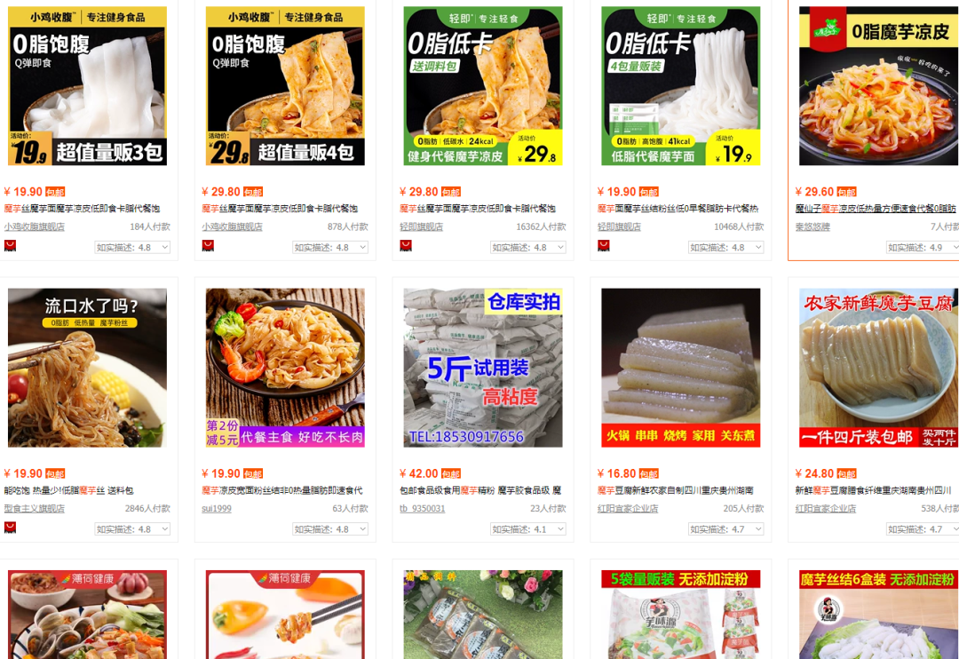 淘宝随便一搜,就出现了:魔芋米、魔芋面、魔芋爽、魔芋饼干、魔芋代餐……