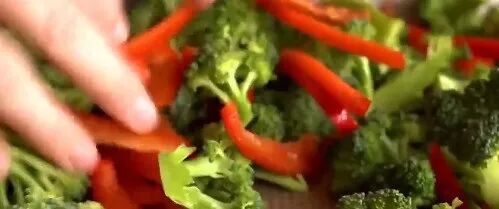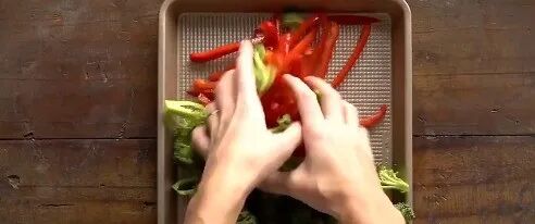 将西蓝花、彩椒放到另一个烤盘中,加入橄榄油、海盐、黑胡椒,抓匀