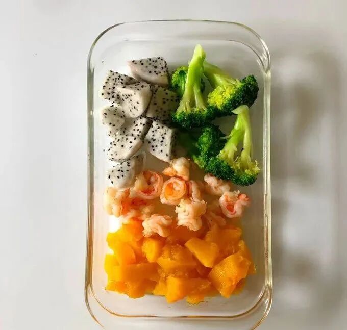 做法:虾去头去壳去虾线,用少许盐腌制,再用橄榄油煎熟,南瓜去皮切块蒸熟,锅里放入一碗水,加适量橄榄油和适量盐调匀,把西兰花放入焯熟,火龙果去皮切块。