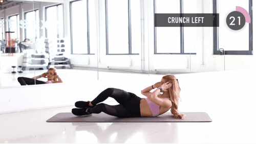动作五:保持腹部收紧,核心发力,上半身左右选装触到身体两侧的地面,持续30秒。