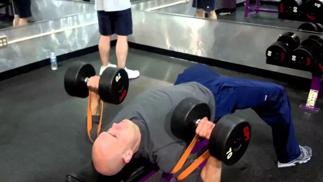这种训练可以用于突破瓶颈期。在哑铃上装上弹力带来练卧推,你的三头肌和胸肌都会受到强烈的阻力。