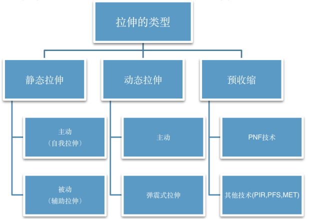 尽管有很多形式的拉伸,但静态拉伸似乎是用在运动后冷却过程中最常见的类型。拉伸也被分类为急性或慢性。急性拉伸通常是指持续> 30 秒或更短时间的单一拉伸。慢性拉伸是指在几天甚至几周内的重复拉伸