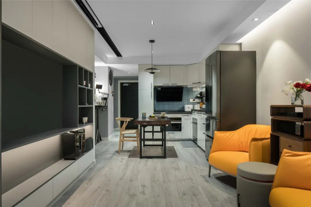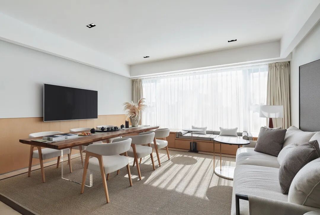 客厅不要沙发也是可以的,这样可以为家人共处留下更多空间,可以放置一张大桌子,或打造成儿童游戏区。空置的客厅中央放置一个大书桌,既能满足办公的需要,没有餐区的小伙伴还可以用来当餐桌。