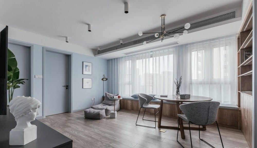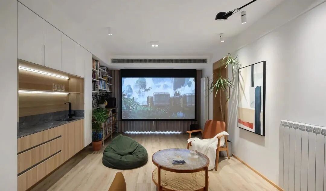 现在很多朋友回到家里都不看电视了,没有需要电视当然可以不要,自然也就不需要电视柜等一系列的配套家具了。如此一来空下来的这面墙就可以做很多设计,比如展示墙、书架、储物柜等。