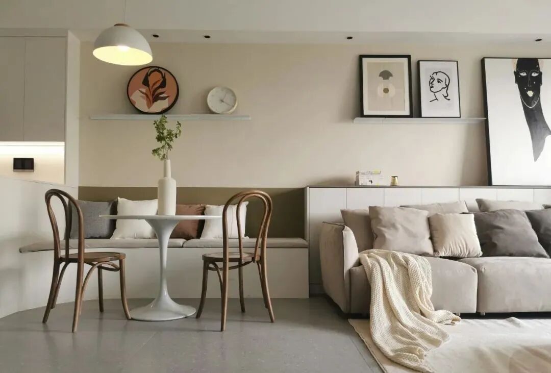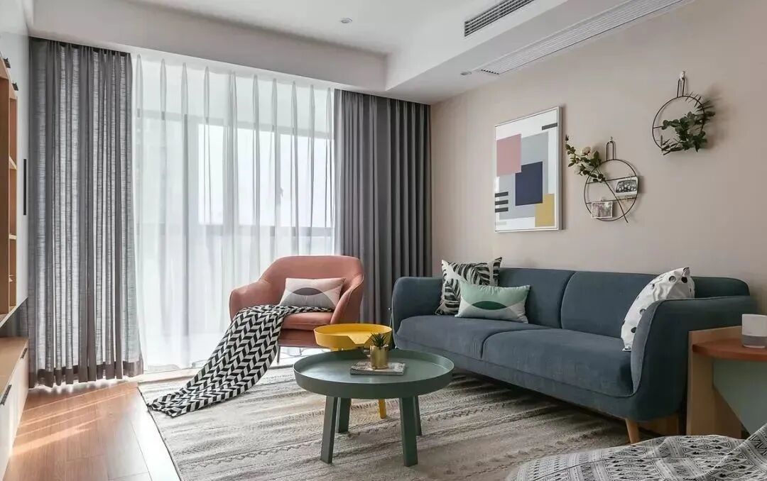 客厅放置茶几的主要作用是收纳,不想茶几占据家里的半壁江山,又想要小物件有地方收纳,可以用边几代替茶几,或者在沙发后面放个长条桌。