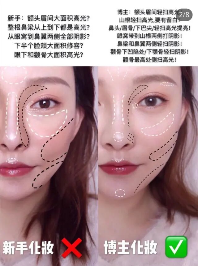 新手很喜欢直直地在鼻梁上打高光,但效果真的不好!可以用点涂的方式在鼻梁和鼻头上一点高光,颧骨用斜扫的方式,提亮唇峰和眉骨可以让五官更紧致。