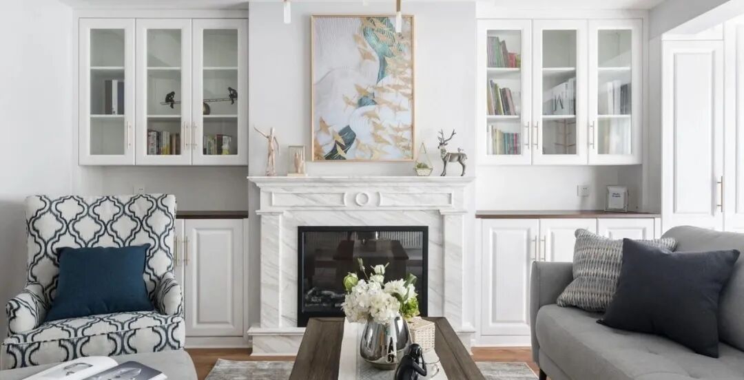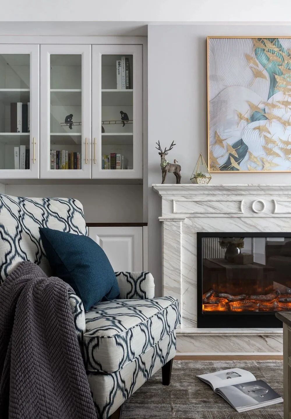 背景墙两端装对称式书柜,营造充满文学气息的氛围。中间设壁炉造型,更具美式韵味,挂画、精美饰品,让效果更时尚。