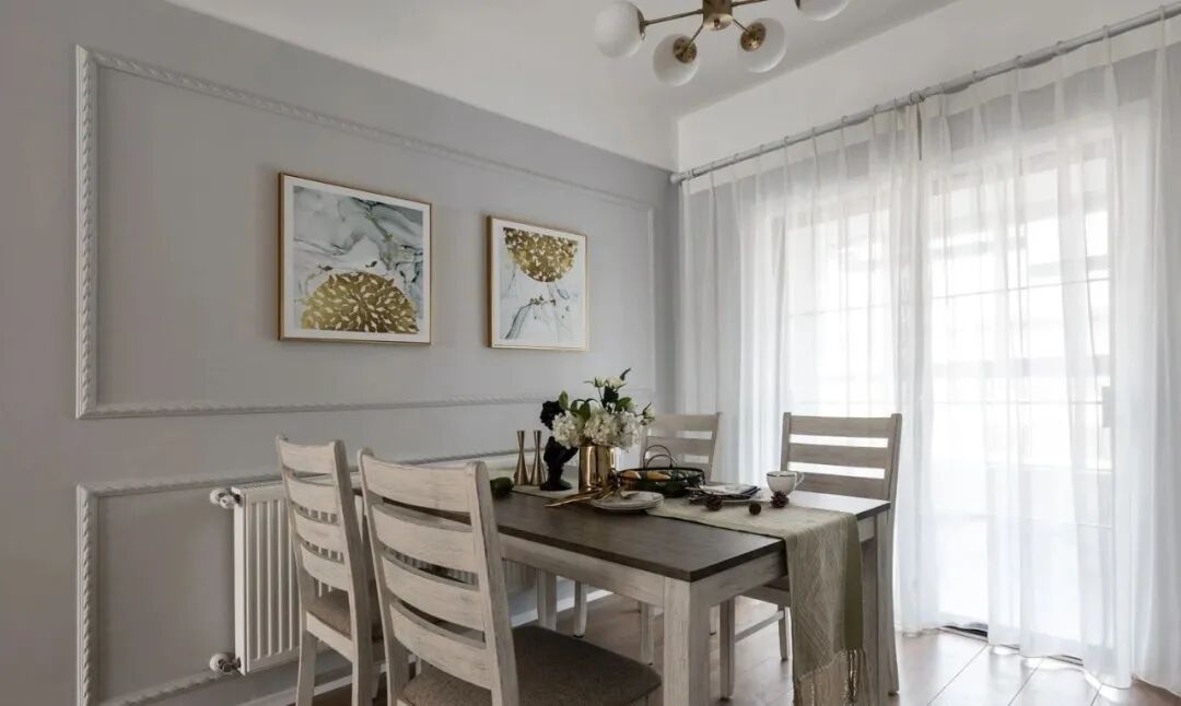 光线透过纱帘,缓缓进入餐厅,给明亮的日光加上了一层温柔的滤镜。餐厅墙面以石膏线条搭配奶油灰为主,还有挂画装饰,简单却独具魅力。