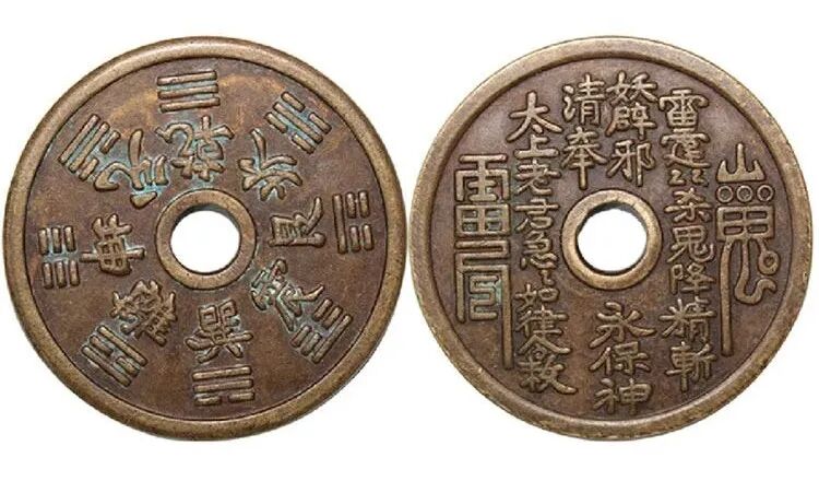 花钱源于汉代,虽然具有钱币的形态,但不作流通使用,是钱币中的"非正用品"。山鬼花钱,清代道士用来施法以降妖震鬼驱邪的载体,也可叫法器。经道士开光后,百姓请回挂于家中镇宅或随身携带保平安。山鬼花钱一面是八卦图,另一面中间竖书二十七字咒语“雷霆雷霆、杀鬼降精、斩妖辟邪、永保神清。奉太上老君急急如律令敕”。左右为四字符文,又作“仙篆”。符文释为“雷令杀鬼”,左为“雷令”,右为“杀鬼”。