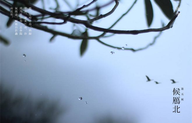 《月令七十二候集解》中说:“正月中,天一生水。春始属木,然生木者必水也,故立春后继之雨水。且东风既解冻,则散而为雨矣。”意思是说,雨水节气前后,万物开始萌动,春天就要到了。如在《逸周书》中就有雨水节后“鸿雁来”“草木萌动”等物候记载。