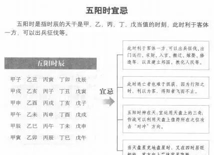 “五阳时”就是指甲、乙、丙、丁、戊这五个天干当值的时刻。“五阳时”是利于客方进攻的时辰,做事宜先动,不利静不利主。