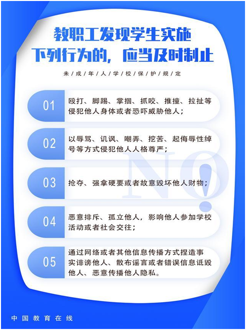 教育部发布了《未成年人学校保护规定》。《规定》设计了防治学生欺凌的规则体系:明确学生欺凌的概念,强调主体上的特定性、主观上的故意性、后果上的伤害性,把学生欺凌和校园暴力、学生间正常的嬉闹等区别开来。明确学生欺凌的行为表现,归纳了侵犯身体、侮辱人格、侵犯财产、恶意排斥、网络诽谤或传播隐私等五类欺凌行为。
