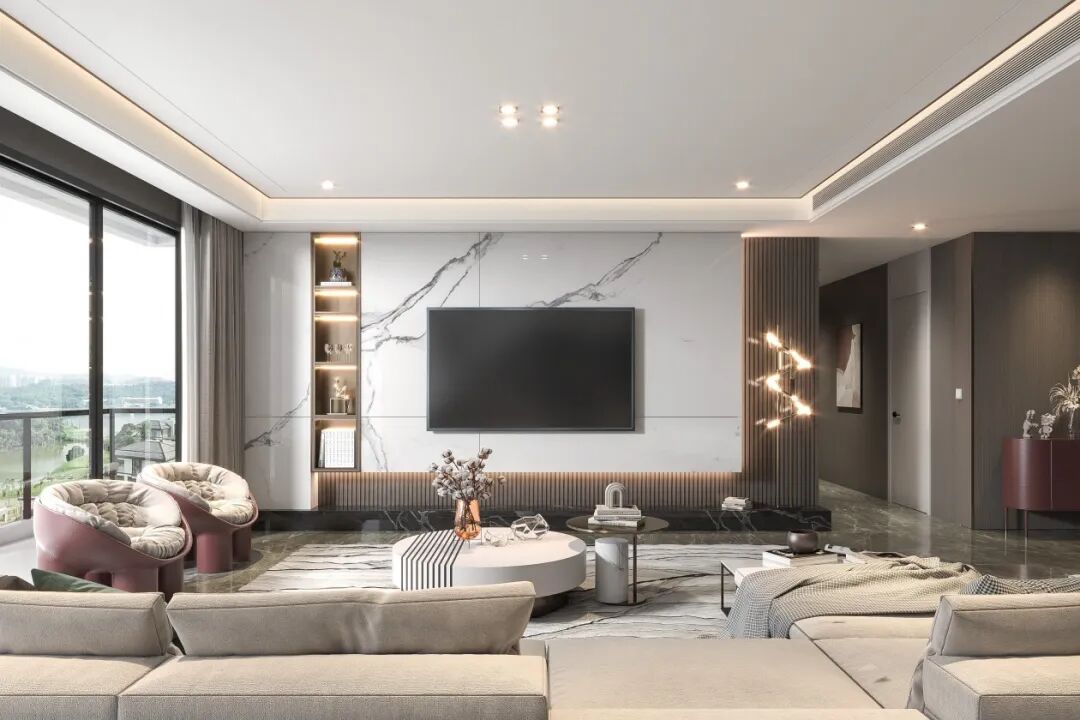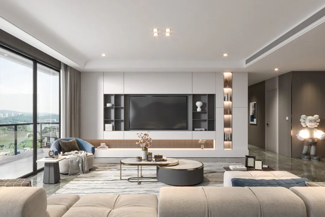 装修客厅的时候纠结了好久,想要保持光秃秃的大白墙?建议尝试隐形式的收纳电视柜。不仅可以增加收纳功能,还可以和墙面的样式保持统一。电视墙的下端设计了内凹的搁板造型,并且安装了氛围灯,看着是不是既可以收纳又很有质感呢。