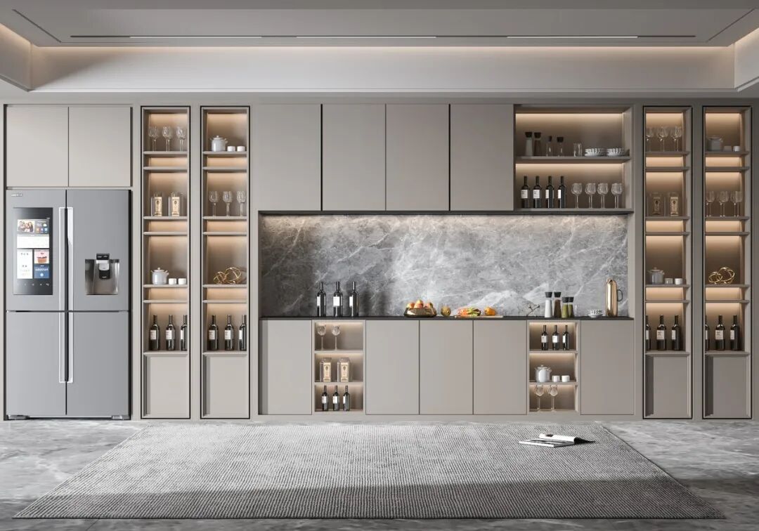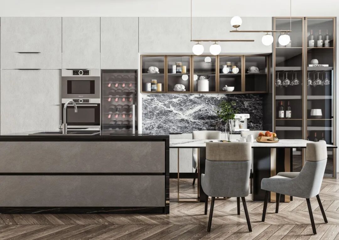 为了满足人们对时尚家居生活的追求,设计的餐边柜兼具了实用和美观的要求,既可以储存物品,也能够装饰餐厅。收纳型的定制餐边柜,通常都是做成整面墙,一柜满足客户的收纳需求。可以说是家里的黄金收纳区。开放式中岛吧台连着餐桌做延伸设计,不仅让厨房的工作动线更顺畅,也能营造大宅气势的格局。平日早餐或喝茶、聊天可直接在吧台进行,这样宽敞无阻的生活模式你喜欢吗?