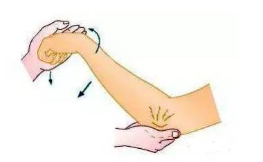 2、前臂稍弯曲:手呈半握拳,腕关节尽量屈曲,然后将前臂完全旋前,再将肘伸直。如在肘伸直时,肱桡关节的外侧发生疼痛者,就要怀疑“网球肘”。