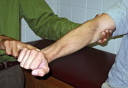 或者可以将肘关节伸直,腕关节如图做最大程度的屈曲动作,自己或请人帮助下压手腕,如果肘关节处疼痛,也提示可能是“网球肘”。