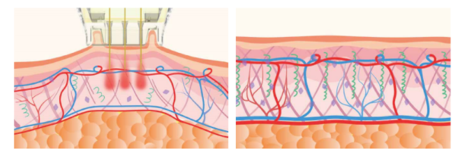 黄金微针利用高速黄金射频技术作用于皮肤,皮肤内的分子随着黄金射频高速运动后产生热能(55-60℃),当真皮网状层的胶原纤维被加热到一定温度时,会发生即刻收缩和变性,并激活持续的胶原新生和重塑。