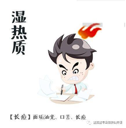 湿热体质的人,面部和鼻尖总是油光发亮,脸上容易生粉刺,皮肤容易瘙痒。常感到口苦、口臭或嘴里有异味,大便粘滞不爽,小便有发热感,尿色发黄,女性常带下色黄,男性阴囊总是潮湿多汗。患病倾向是疮疖、黄疸等病。