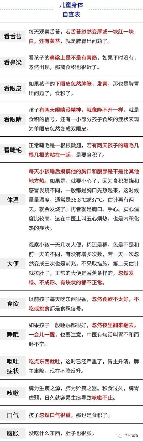 另外还有一个方法教大家这样来判断,通过这张自查表,自测儿童脾胃好坏。