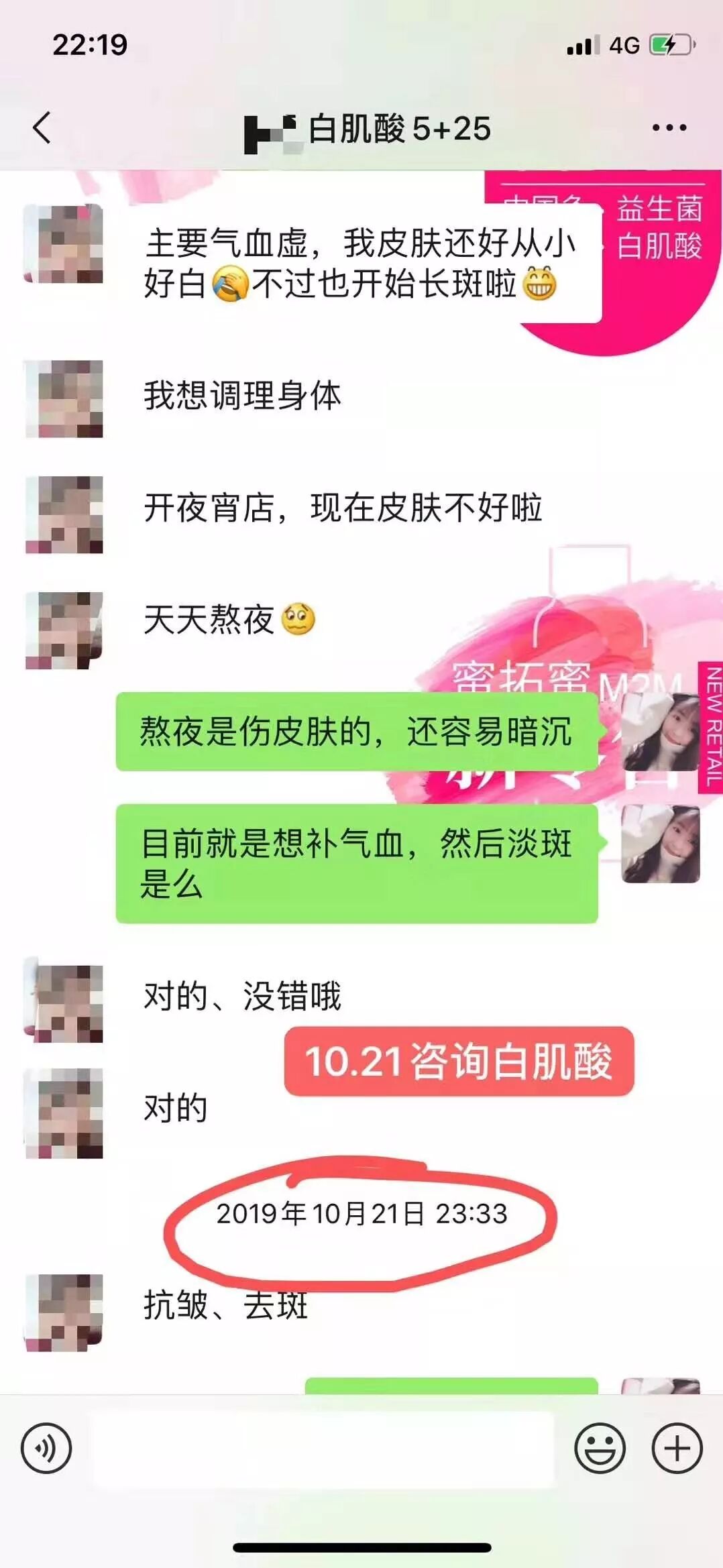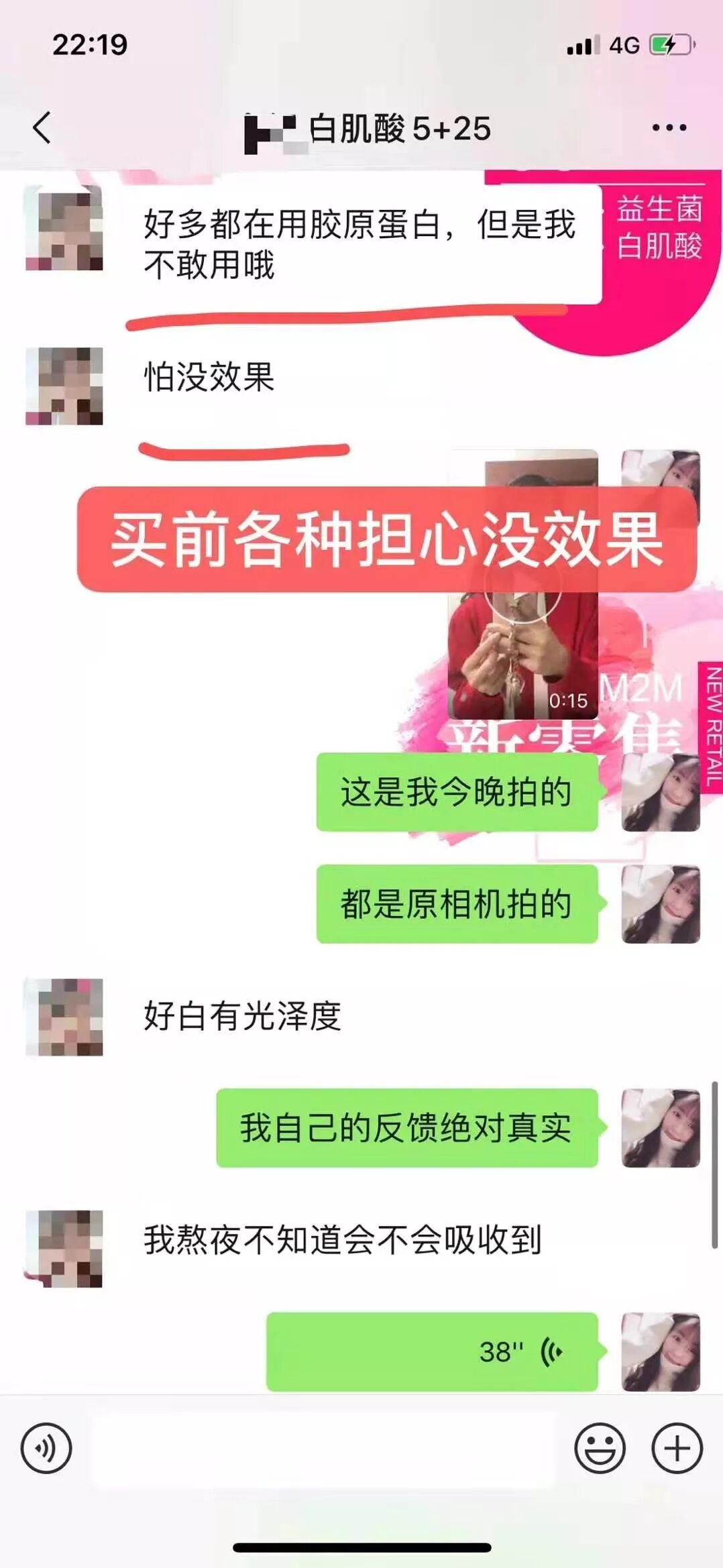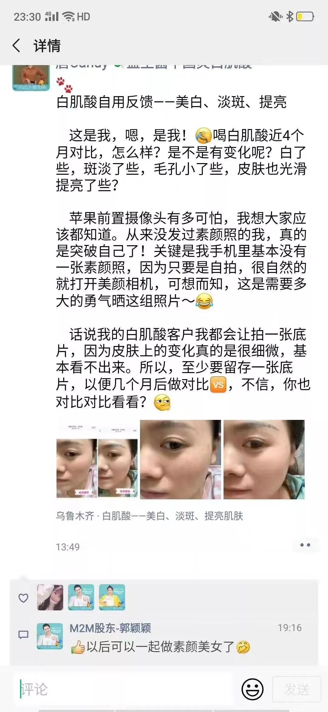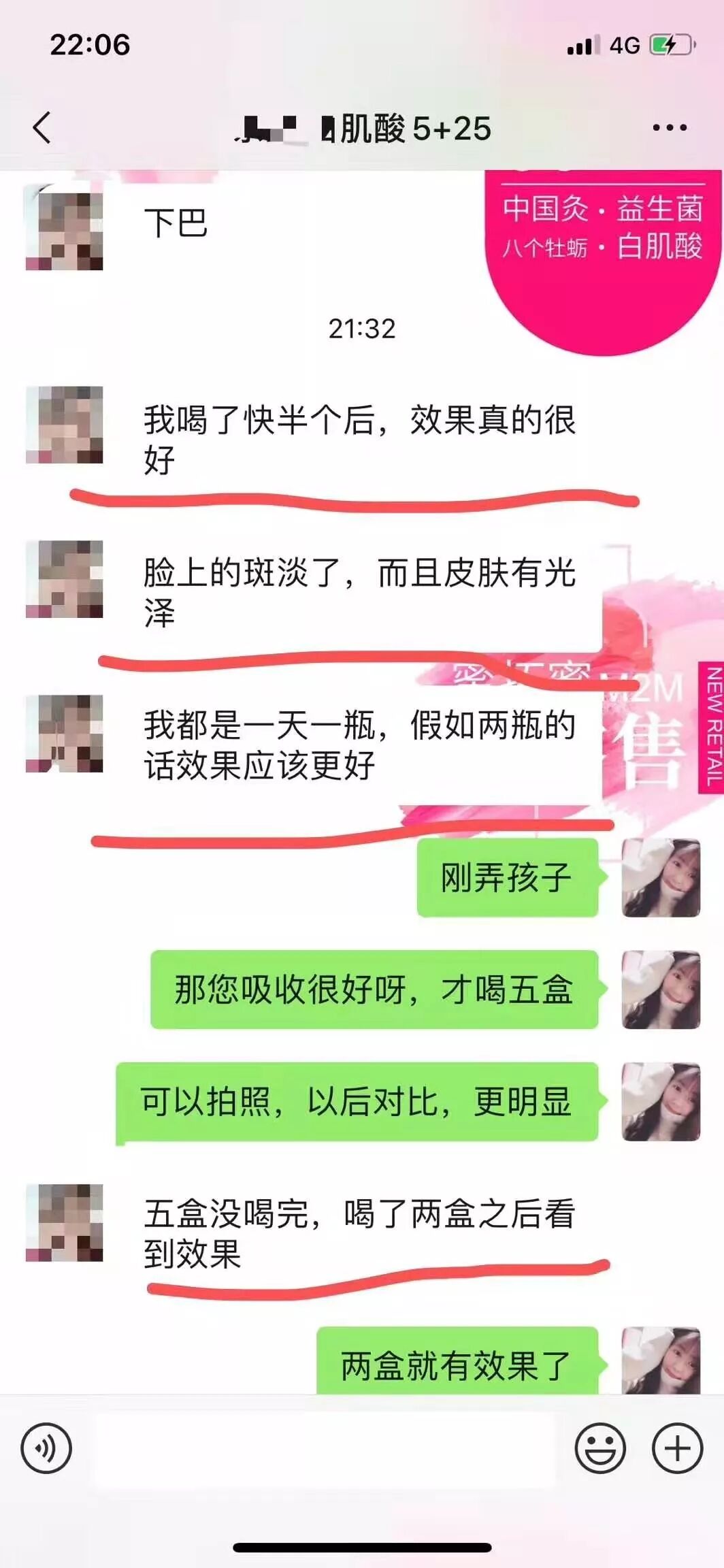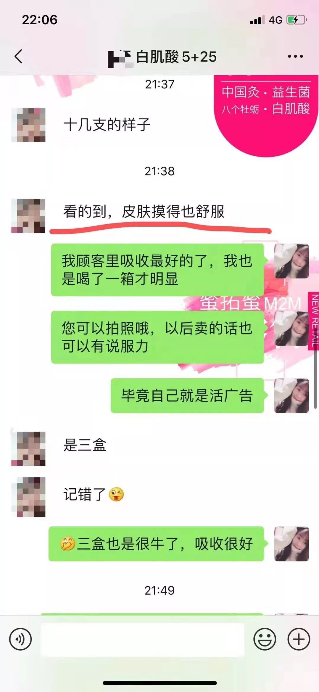 顾客喝三盒白肌酸就效果明显了,斑淡了,脸色有光泽,脸摸着舒服!已经准备代理卖了!吸收最好的顾客,我都有点吃惊,简直像拖一样的反馈