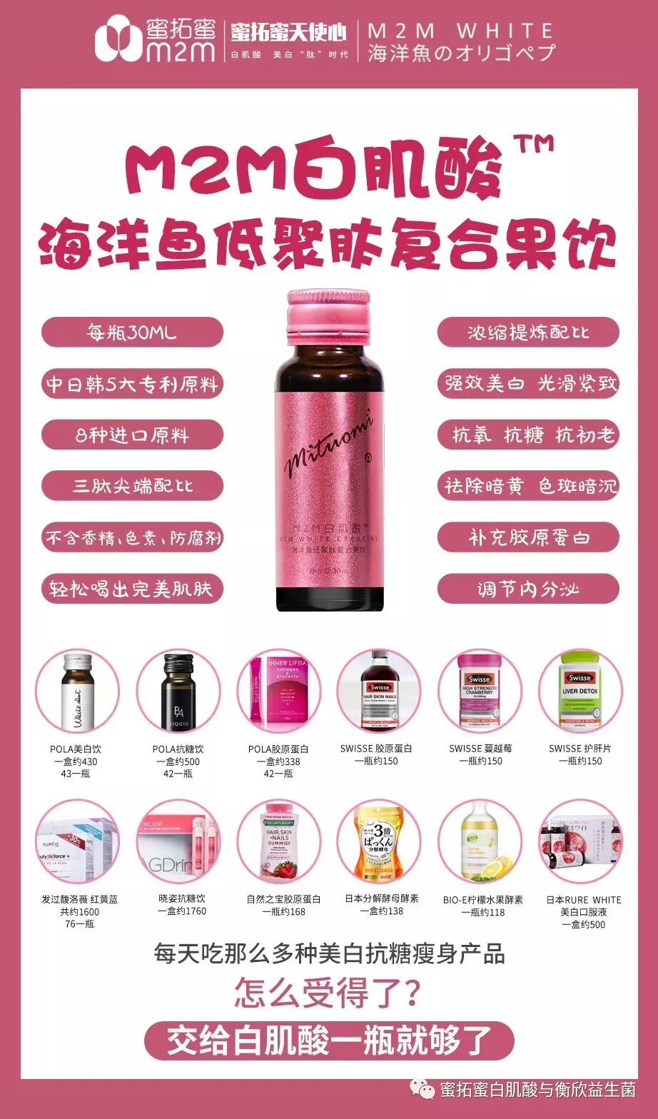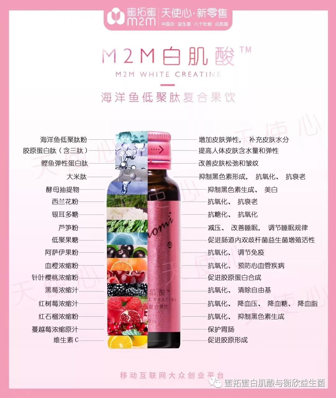 蜜拓蜜M2M白肌酸(海洋鱼低聚肽复合果饮),是蜜拓蜜耗费2年时间,从国内外多方对比,严苛甄选供应商,精心研究、挑选,并通过严格检验,取得合格检验报告,精制而成的一款低聚肽复合果饮。