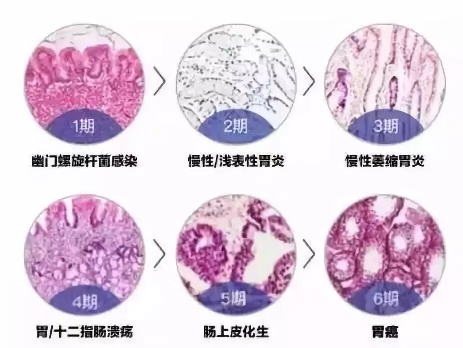 幽门螺旋杆菌感染发展到胃癌,还需要经历慢性浅表性胃炎、萎缩性胃炎、肠上皮化生、不典型增生四个阶段。