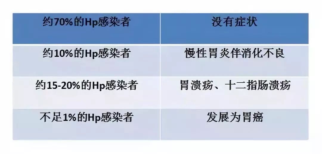 数据表明,70%的人感染幽门螺杆菌后没有症状,10%的人可能存在消化不良,表现为腹胀、食欲不振、发酸、打嗝、恶心、口苦、口臭等。10%~20%的人可能有消化道溃疡。