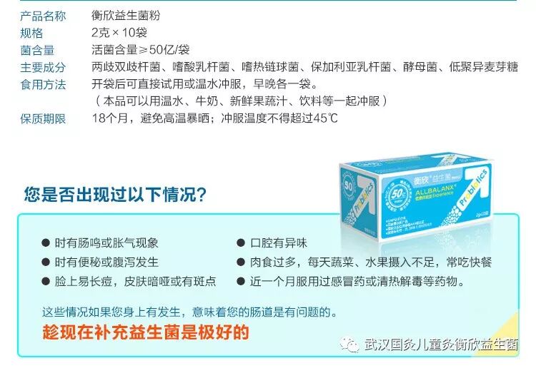 衡欣牌益生菌冲剂是以长双歧杆菌、两歧双歧杆菌、嗜热链球菌、嗜酸乳杆菌、德氏乳杆菌保加利亚亚种、低聚异麦芽糖、水溶性膳食纤维、脱脂奶粉、木糖醇为主要原料制成的保健食品,经动物功能试验证明,具有增强免疫力的保健功能,经动物功能和人体试食试验证明,具有通便的保健功能