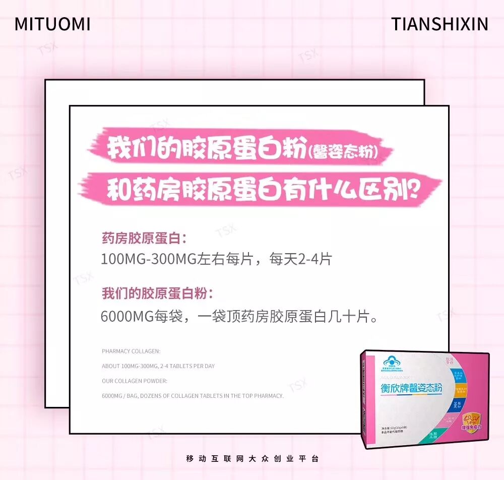我们的胶原蛋白粉:6000mg每袋,一袋顶药房胶原蛋白几十片。我们把胶原蛋白分享出去,是真的能带出去健康的。