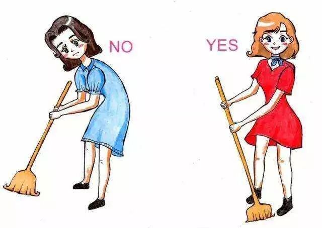 扫地拖地时,拖把的把要足够长,避免过度弯腰,造成腰肌劳损。