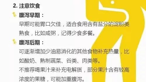 腹泻在急性水泻期的第一天内可暂时禁食,减少食物对肠道的刺激,并使肠道得以休息。必要时由静脉输液,以防失水过多而脱水。