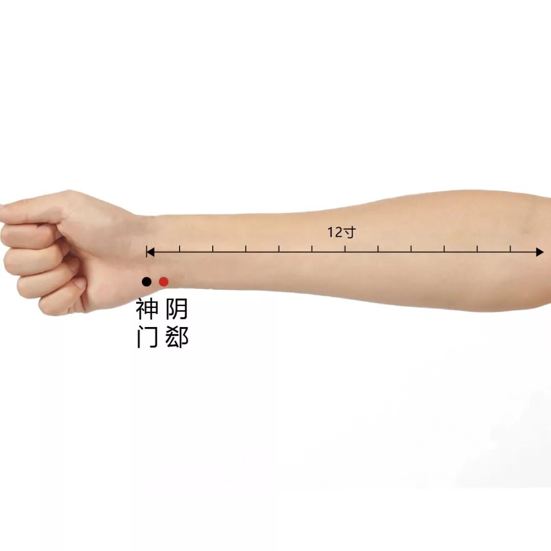神门穴位于腕横纹尺侧端,尺侧腕屈肌腱的桡侧凹陷处。刺激此穴能交会心肌气血,振奋心脏的阳气。