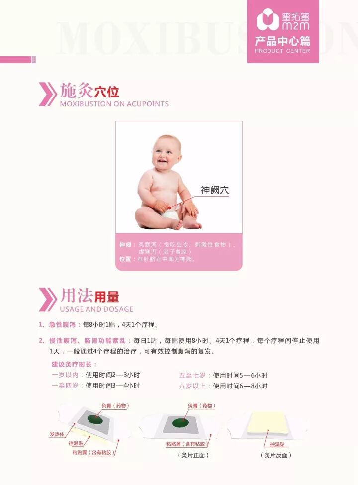 2、慢性腹泻、肠胃功能紊乱:每日1贴,每贴使用8小时。4天1个疗程,每个疗程间停止使用1天,一般通过4个疗程的治疗,可有效控制腹泻的复发。