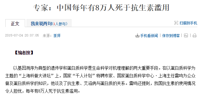 中国平均每年已经有8万人死于抗生素滥用!(数据来源:国家“千人计划”特聘专家、国家蛋白质科学中心上海主任雷鸣)