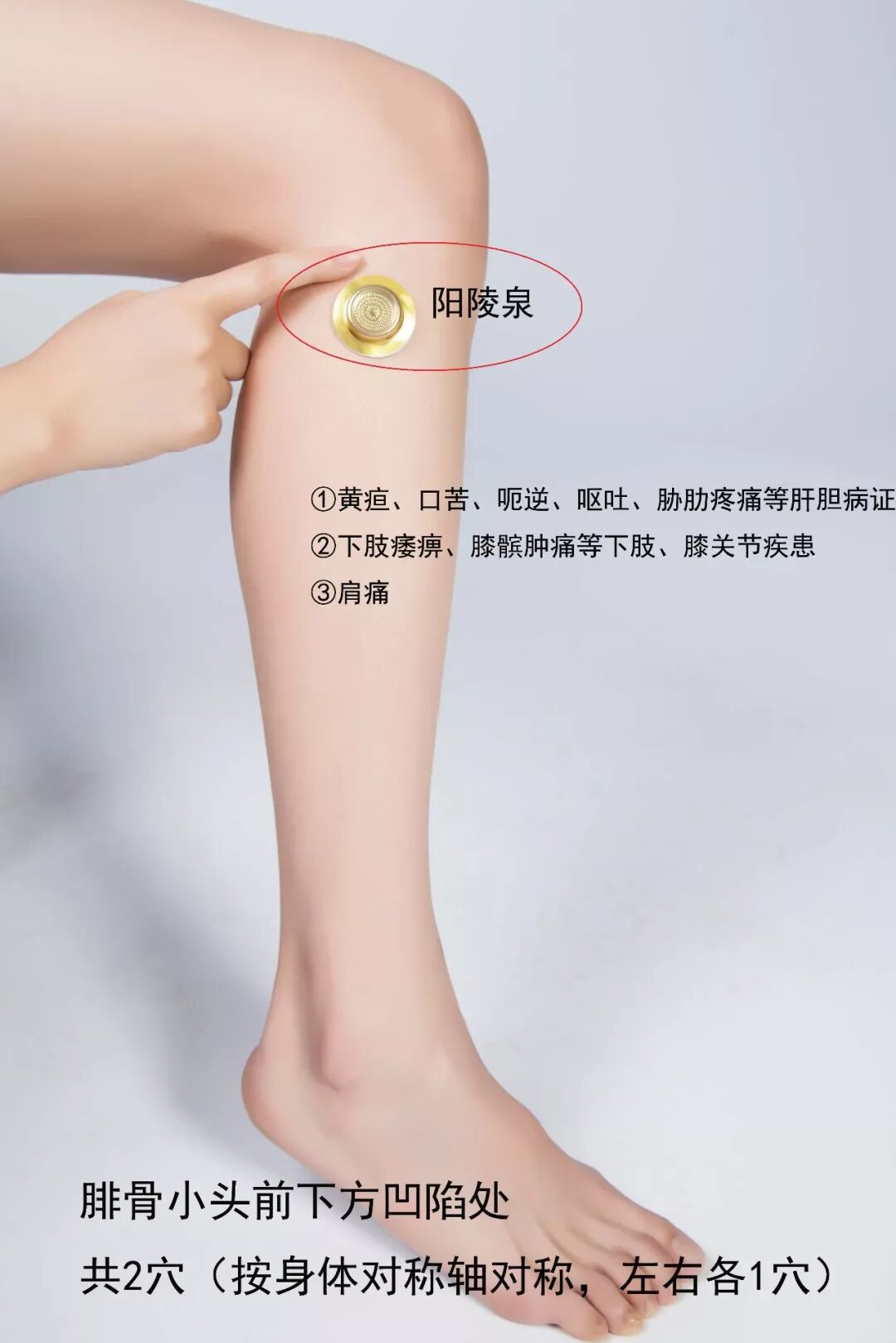 阳陵泉穴,在小腿外侧,腓骨小头前下方凹陷处。它最初见于《灵枢》。其中的阳,指的是“外侧”。其中的陵,指的是腓骨小头的“高处”。泉,指的是凹陷处,经水汇聚如泉。阳陵泉的名字,就是这么来的。