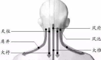 最后从风池刮至肩井(风池到颈根部从上向下刮,肩井从内向外刮)。