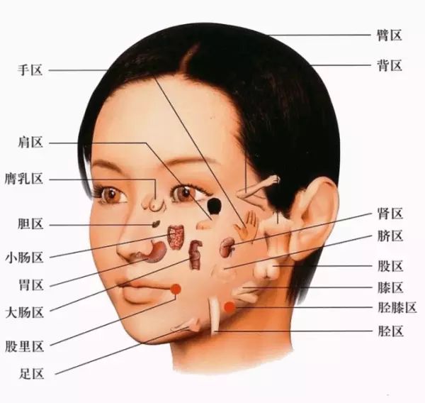 8、肾区:发暗肾虚。有红疙瘩是腰酸和全身有酸痛的地方,侧脸颊有下凹的地方为肾虚,耳朵小肾虚。