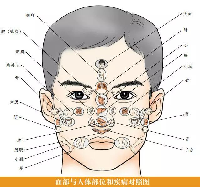 婴儿的脸是洁净的,当他(她)们断奶吃食物后才显示出心、肝、脾、胃、肾、五脏的能力;随着年龄越大,在脸上表现出来的状态越多。不外乎有痘、痔、色斑、痕、纹路;一般青少年以痘表现,一般中年人以皱纹表现,老年人以斑表现。