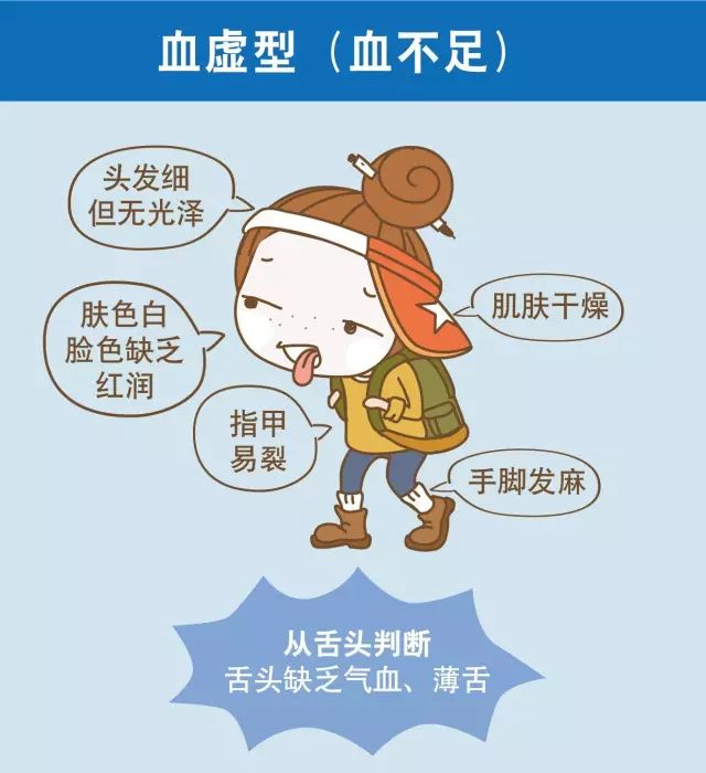有皮肤干燥、容易疲倦,手脚发麻等症状,可能为血量不足造成的(血虚)体质。特征为脸色苍白、头发细但无光泽、指甲易裂等。