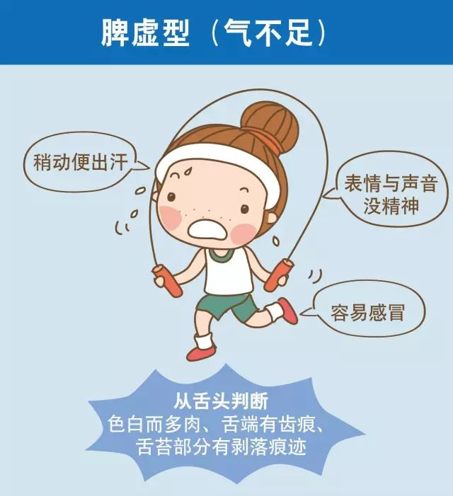 因脾脏机能减退,造成气不足,是容易疲倦和感冒的体质。特征为脸色不佳、偏瘦、声音和表情没精神,就算天气不热但稍动就会出汗,还会有站起时晕眩、手脚无力、容易瘀血黑青等症状。