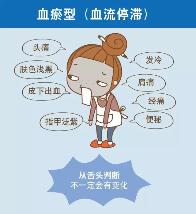 这类体质的人嘴唇、牙龈以及指甲会呈泛紫色,也常有皮下出血的现象。血液循环不良造成的肩膀疼痛和头痛、发冷以及便秘、经痛等症状,亦会加重。